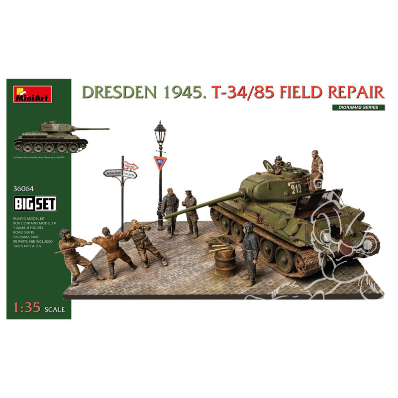 Maquette du Coffret DRESDEN 1945 , coffret avec 1 char Russe T34/85 + figurines de la marque MINIART à l'échelle 1/35