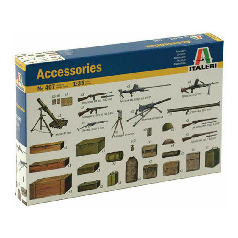 Maquette d'EQUIPEMENT ET ARMES se composant d'armes,de casques, de caisses de munitions et d'autres accessoires divers de la marque ITALERI à l'échelle 1/35