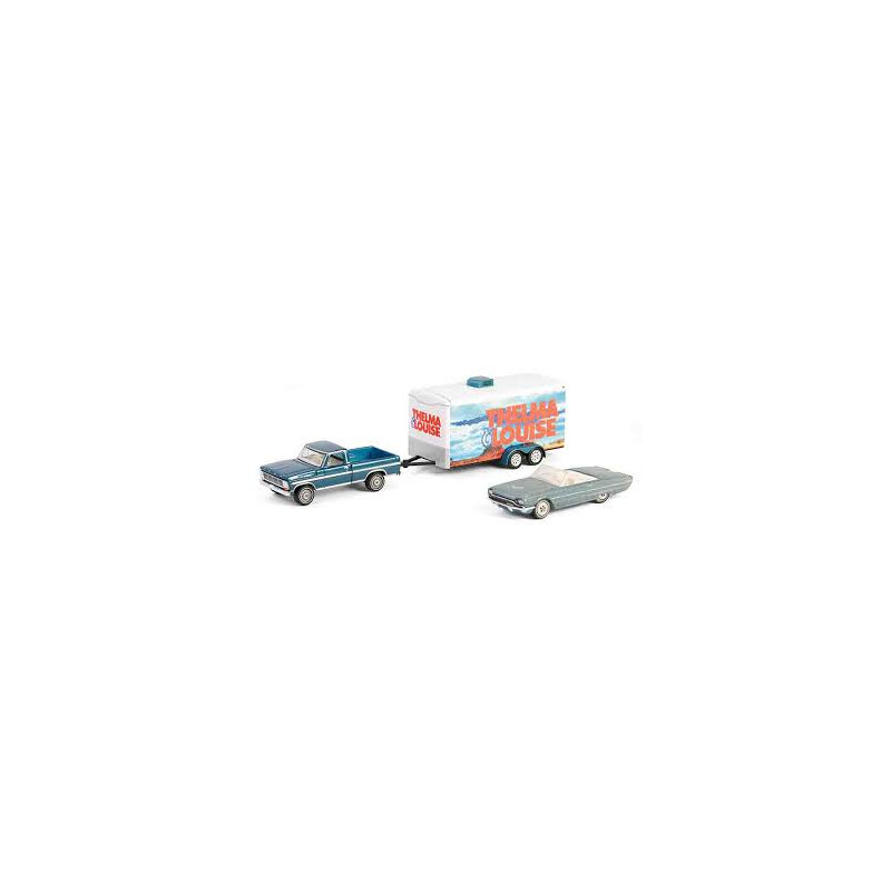 Set de Véhicules Ford Thunderbird de 1966 de couleur gris avec Ford F-250 de 1967 de couleur vert avec remorque du Film THELMA et LOUISE de 1991 de la marque GREENLIGHT à l'échelle 1/64