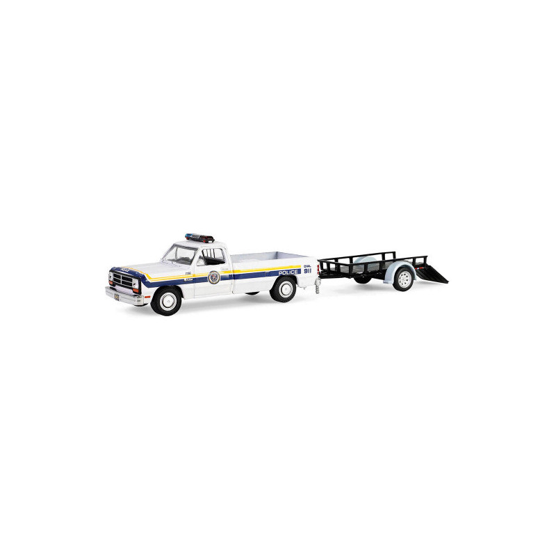 Dodge Ram D-250 avec remorque de 1990 de couleur blanc de la Police de PHILADELPHIE dans la Collection HOT PURSUIT de la marque GREENLIGHT à l'échelle 1/64