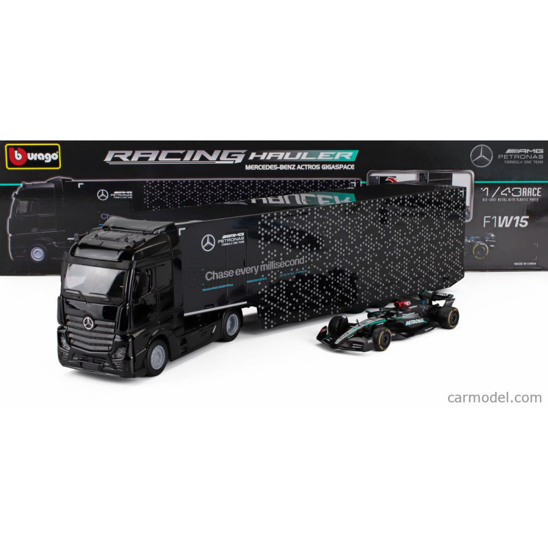 Camion de Transport Mercedes Benz Actros Gigaspace MERCEDES AMG avec une Formule 1 W15 aléatoire inclus de la marque BURAGO à l'échelle 1/43