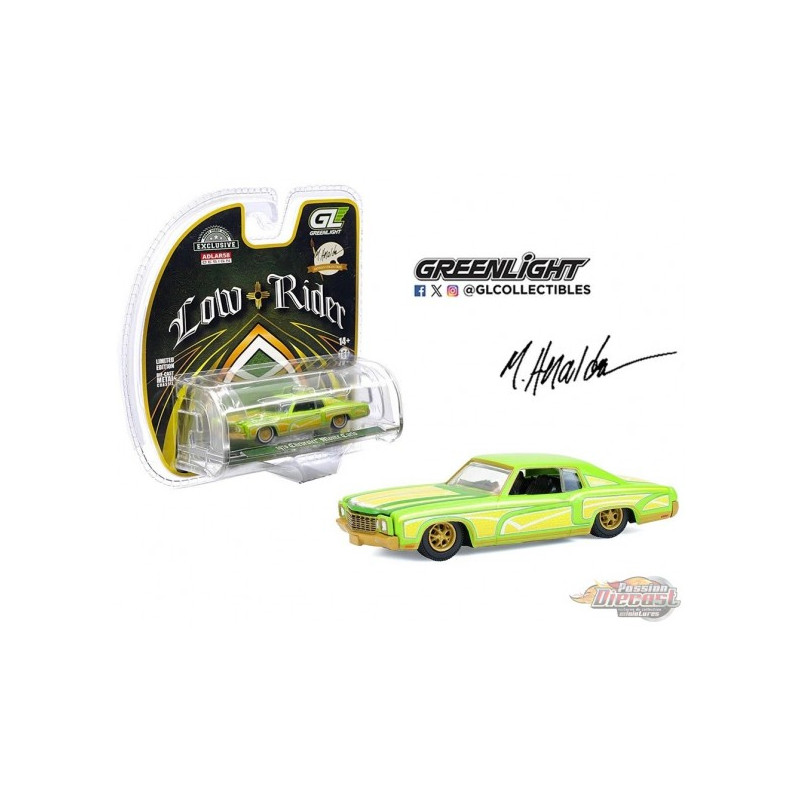 Chevrolet Monte Carlo de 1970 de couleur vert et jaune Version Lowrider de MICHAEL HERALDA de la marque GREENLIGHT à l'échelle 1/64