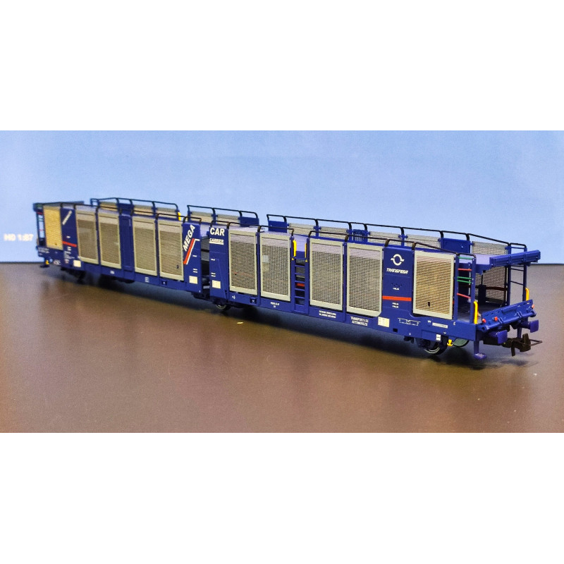Wagons Porte Auto articulé MEGA CAR TRANSFESA de couleur bleu en époque VI de la marque JOUEF à l'échelle HO