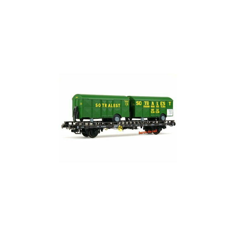 Wagon UFR Biporteur de la SNCF avec deux Remorques Fourgons SOTRALEST, châssis de couleur noir en époque III de la marque REE à l'échelle HO