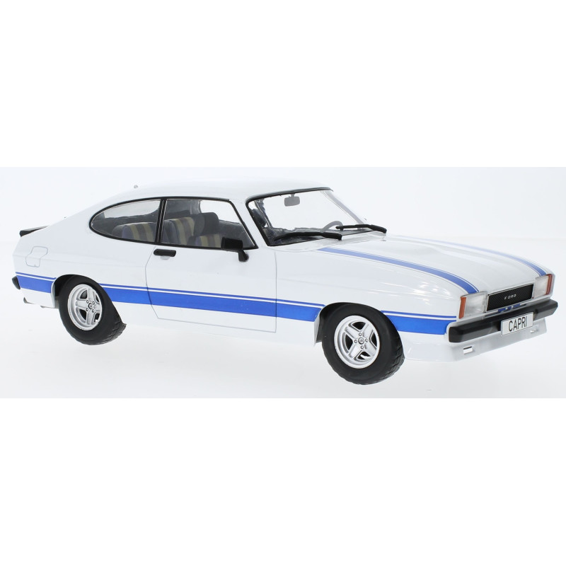 Ford Capri MK.II X-Pack de 1969 de couleur blanche avec lignes bleues de la marque MODELCARGROUP à l'échelle 1/18